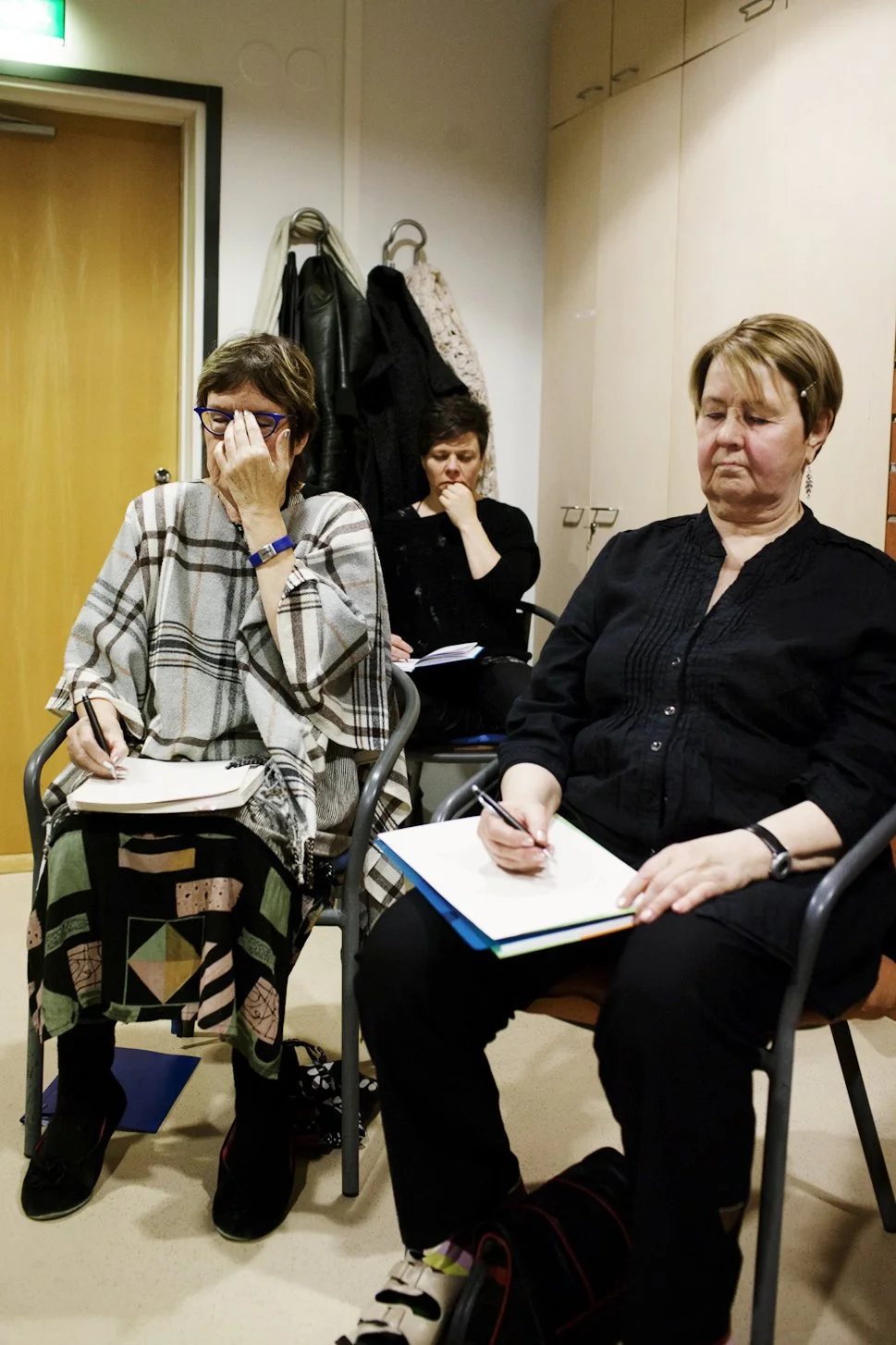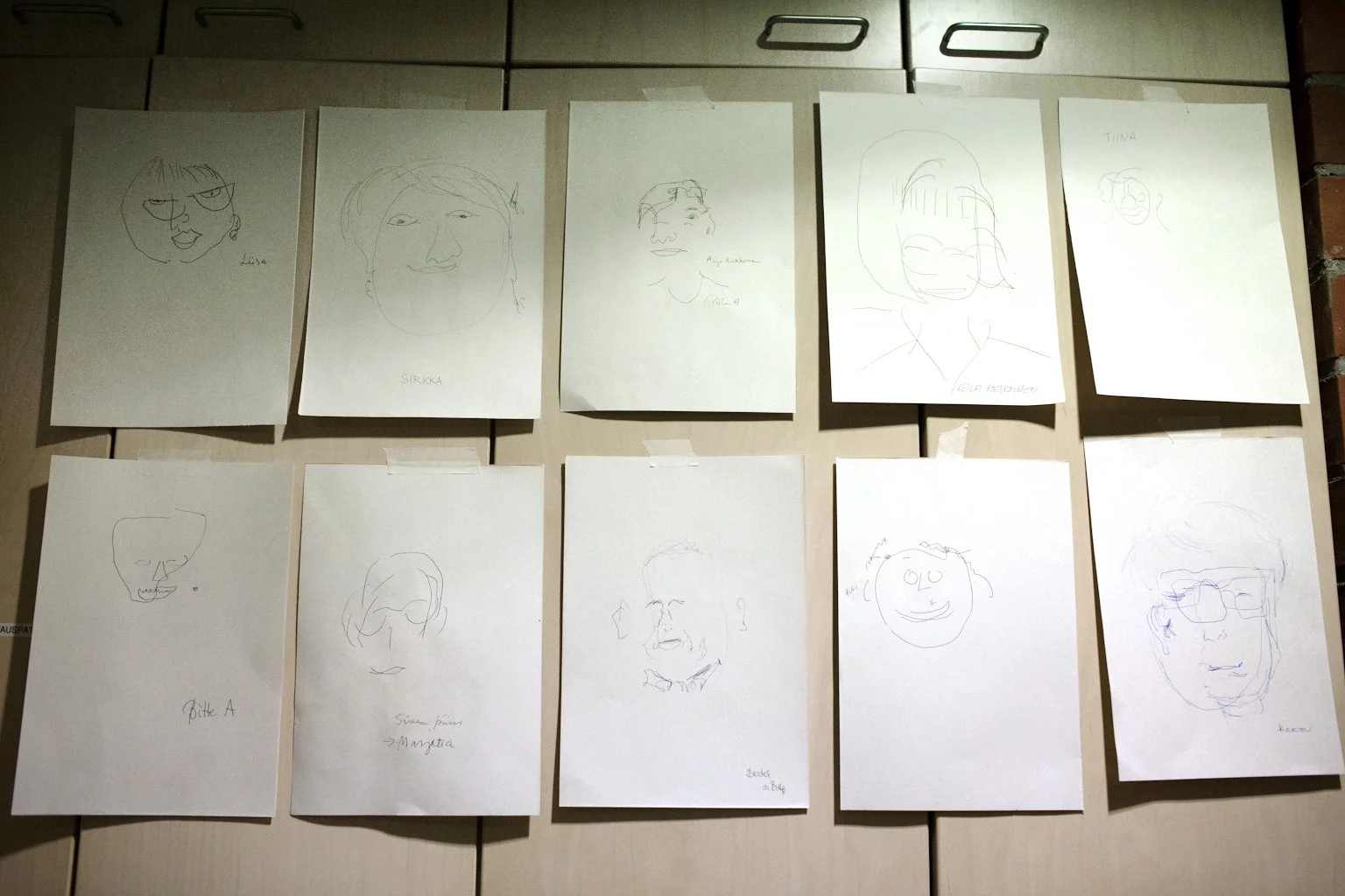 Aloitimme lämmittelyharjoituksella: taideryhmäläiset tekivät kosketusmuotokuvia silmät suljettuina, ja sitten he piirsivät muotokuvia parista katsomatta paperiin.