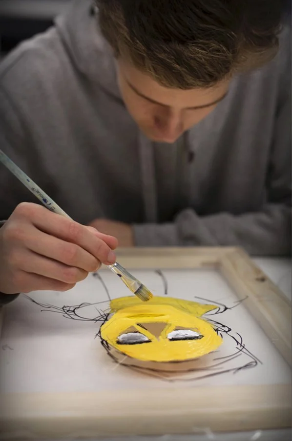 Kun henkilöhahmo oli maalattu, sille tehtiin erillinen tausta. Pidin alustuksen abstraktin taiteen suuntauksista, kuten informalismista ja suprematismista. Ohjasin maalaamaan paperisen taustan informalistiseen tyyliin, tyylisuunnassahan korostettiin taiteilijan spontaaneja emootioita, pyyhkäistiin suunnittelemattomia gestuureita eli eleitä, käytettiin sekatekniikkaa, maalin valutusta ja tahroja. Osa oppilaista käytti sekatekniikkaa ja jotkut liimasivat myös paperia ja narua työhönsä.