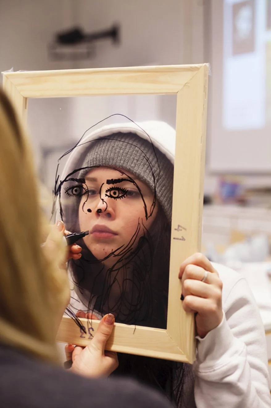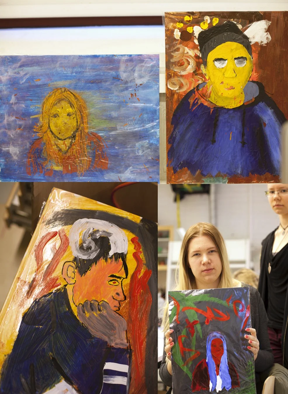 Teetin lukiolaisryhmälle kokeellisen maalaustehtävän parityönä. Tutustuimme sen avulla eri tyylisuuntiin. Sovelsin ja muuntelin kuulemaani ideaa: pingotin kiilakehykseen läpinäkyvän muovin, ja oppilas piirsi sille parinsa vedenkestävällä tussilla parin istuessa mallina muovin takana. Tällä läpipiirtämisellä oli tarkoitus ohjata reippaaseen piirtämiseen ja havainnointiin, ja hypätä “en osaa piirtää näköistä” –pelon yli.